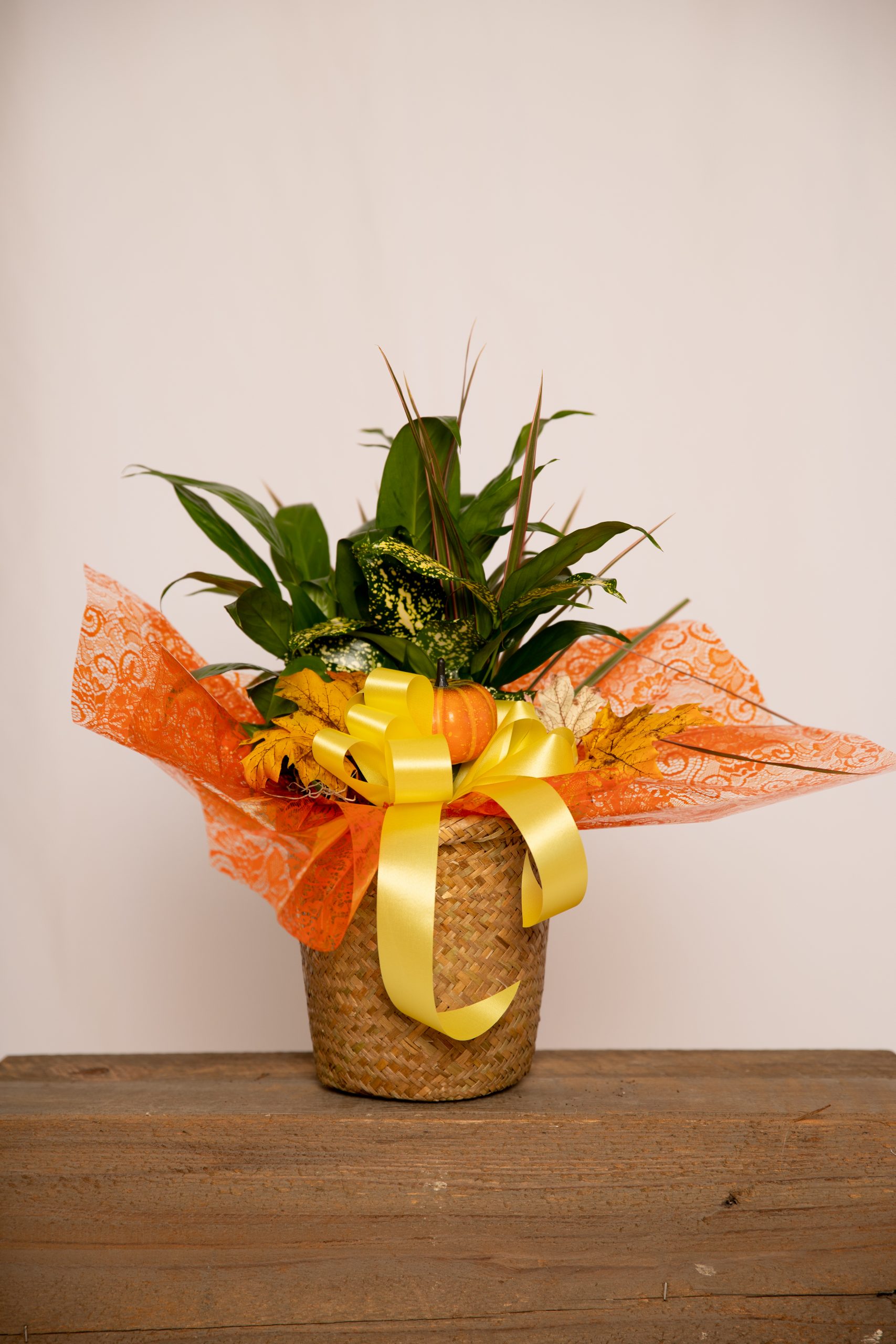 Garden plants, fall leaves, a pumpkin, and tied up with an autumn bow planted in a fall basket.